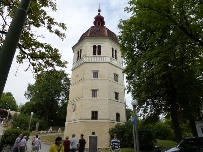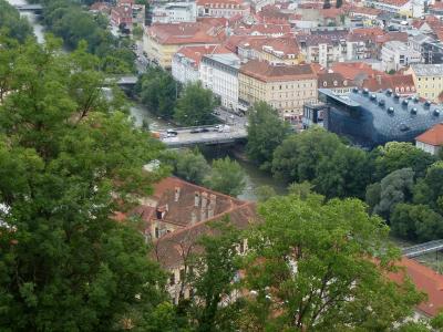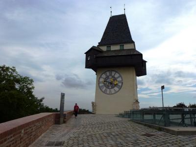 1128年「GRADEC」(砦、小さな城)として古文書に載ったグラーツ。その砦の機能を果たしたシュロスベルク(山城)は町の象徴的な存在。小高い丘で高さ473m。上るには4つの方法がある。ケーブルーカー、エレベーター、蛇行した坂道と崖に作られた階段。我々は、上りにケーブルカー、下りは小道をぶらりと降りる。ケーブルカーで上った所に在る鐘楼の鐘は1587年にトルコ軍が打った大砲の弾101個を溶かして造った。鐘楼は写真のみ撮ったが、この5トンの鐘の音を7時、12時、19時にきける。少し下ったところに時計塔がある。