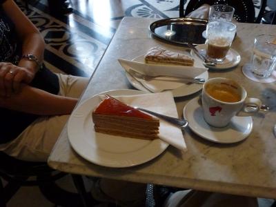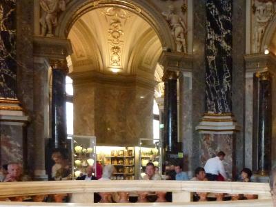 入場料がオーストリア航空の搭乗券を提示すると50%割引されるという特典があったので利用。絵画を見る前に重厚な建物に圧倒される。収蔵されている絵画の数が多くじっくり観るのには時間がかかる。大体部屋単位で分類されているので知っている作家の部屋を重点的に見てその他は歩きながら眺めることにした。ホテルの朝食ビュッフェで満腹状態だったので館内カフェで昼食代わりにケーキを食べる。