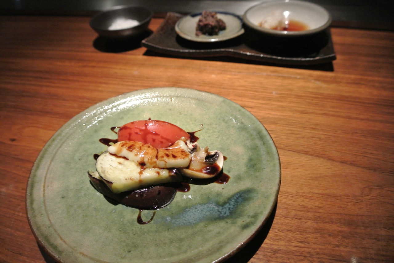途中で頂いた、岡山の吉田牧場のカチョカバッロとナスの焼き物。