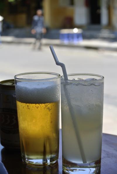世界遺産の旧市街に入る手前の比較的バイクの多く通る道沿いにあるのでばっちり観光客プライスだと思うのですが、大人二人でビール2本、おなかいっぱい食べてもVND400,000(約1600円)くらいです!