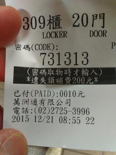 実際に使ったのは台北駅と宜蘭駅のものですが、両方とも鍵がなくロッカー番号+暗証番号(密瑪)で操作し、最初の料金での時間から超過している場合、追加料金を払って鍵をあけるというものでしたが、台北駅のものは暗証番号は自分で設定するものではなく、ロッカー番号と暗証番号が書かれた預かり証が出てくるのに対し、宜蘭駅のものはは自分で暗証番号を設定するものでした。また、宜蘭駅のものはお釣りが出てきませんでしたので、コインロッカー使用の際は小銭を用意した方がいいです。料金は最初の2,3時間で20~30圓程度です。