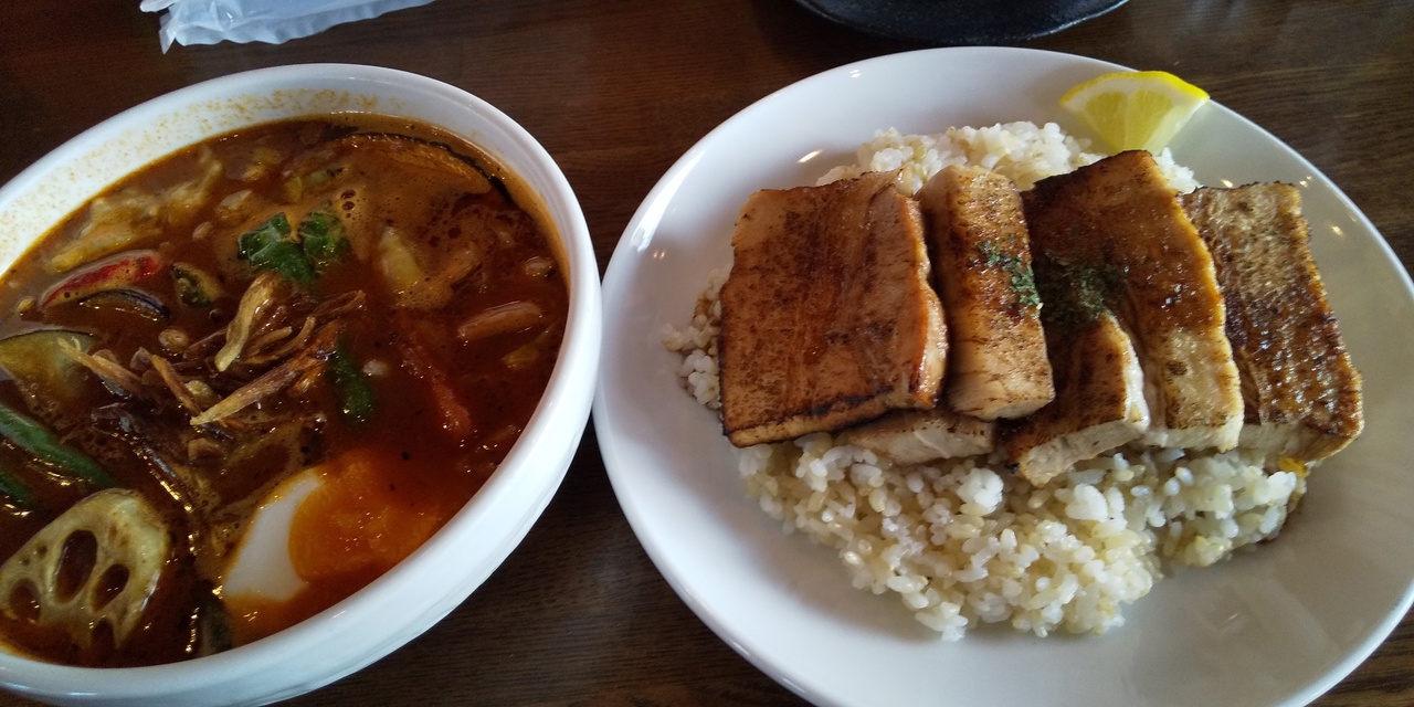 江別市にあるスープカレーチェーン店の江別店。若いスタッフが頑張っています。スパイシーなカレーで辛さは好みでえべます。玄米と白米、トッピングもお好みでチョイス。江別店オリジナルメニューもあり、豚の角煮は柔らかい角煮をライスに乗っけてスープカレー、なかなかユニーク