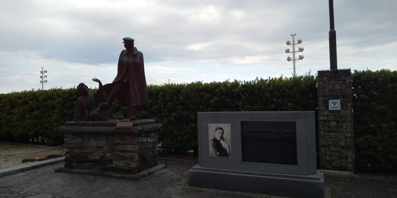 熱海は見処がたくさん、サンビーチにある金色夜叉でお馴染みの貫一とお宮の像と松の木があります。松の木は二代目だとか。男性と女性のアベック像ですがパワーハラスメントを象徴するような明治のストーリー。今ではあり得ない像