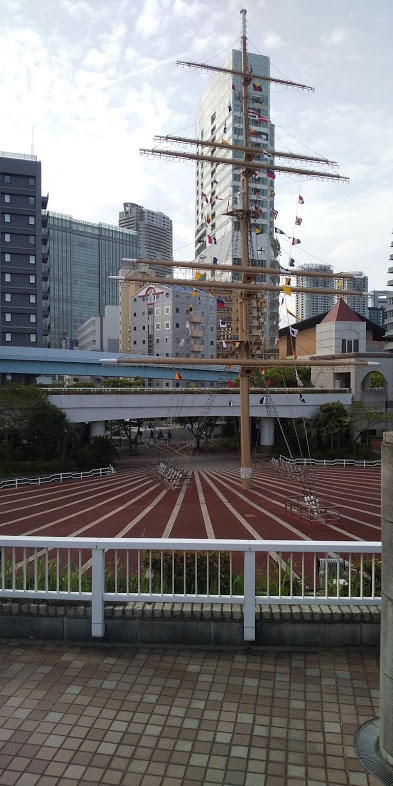 竹芝桟橋前の広場です。昭和平成バブルを通しててここはデートのメッカでした。特に真夏の夜は景色もムードも最高でした。帆船のマストが立っていてかなり遠くからも見えます。嘗ては大きなクラブが近くにあったり恋人の聖地的な所でしたが最近はホテルができたり再開発されてて静かになり落ち着きました