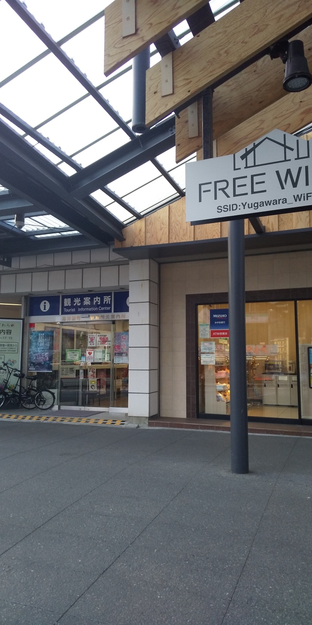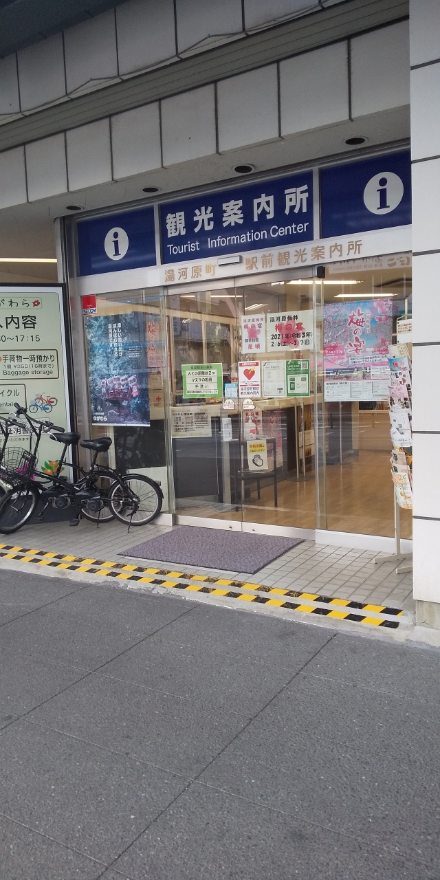 JR湯河原駅の改札口を出てすぐ右にある割りと小さい観光案内センターです。玄関前に自転車が置いてありレンタルサイクルもここで借りることができます。パンフレットも多数。駅の入り口とこの案内所付近はフリwifiエリアになっているので何かと助かります
