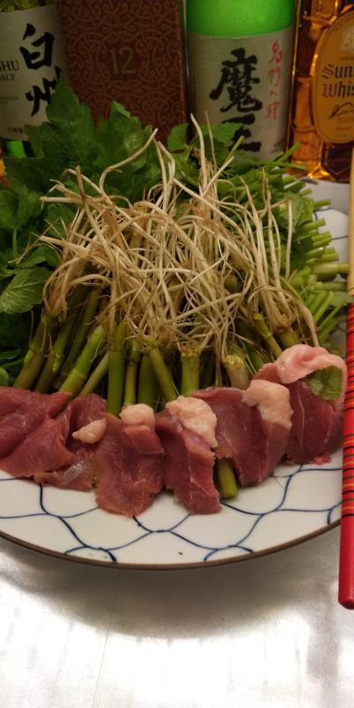 大人の鍋でとてもヘルシー、香味野のセリをしょうゆベースの出汁で鴨肉とともに