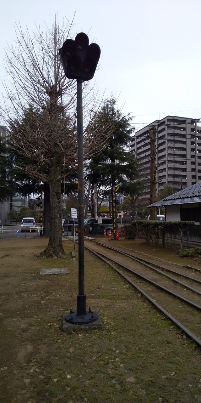 古い駅のプラットホームや信号機やポイントの切り替えの転轍機が