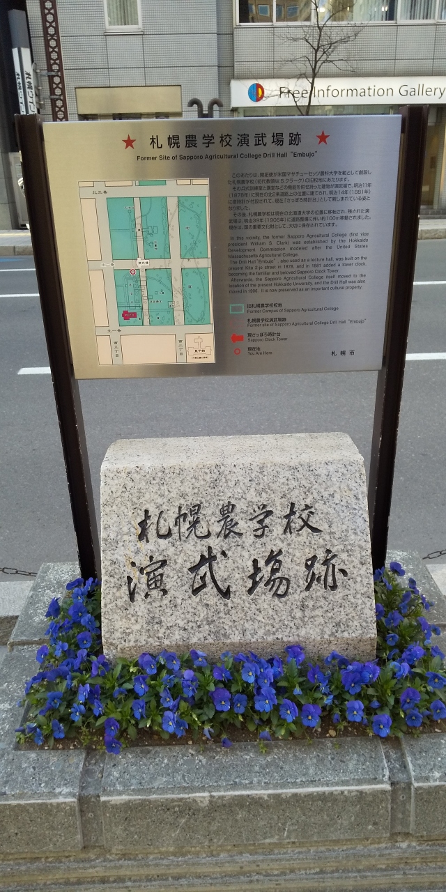 JR札幌駅から大通り公園方面に歩くと突然出くわす記念碑です。時計台や札幌市役所の近くにあり歩道の上に設置されています。碁盤の目のようにに作られた街のビル街の外れにあり殆ど目につかない記念碑です。札幌街歩きで探してみてはいかがでしょうか