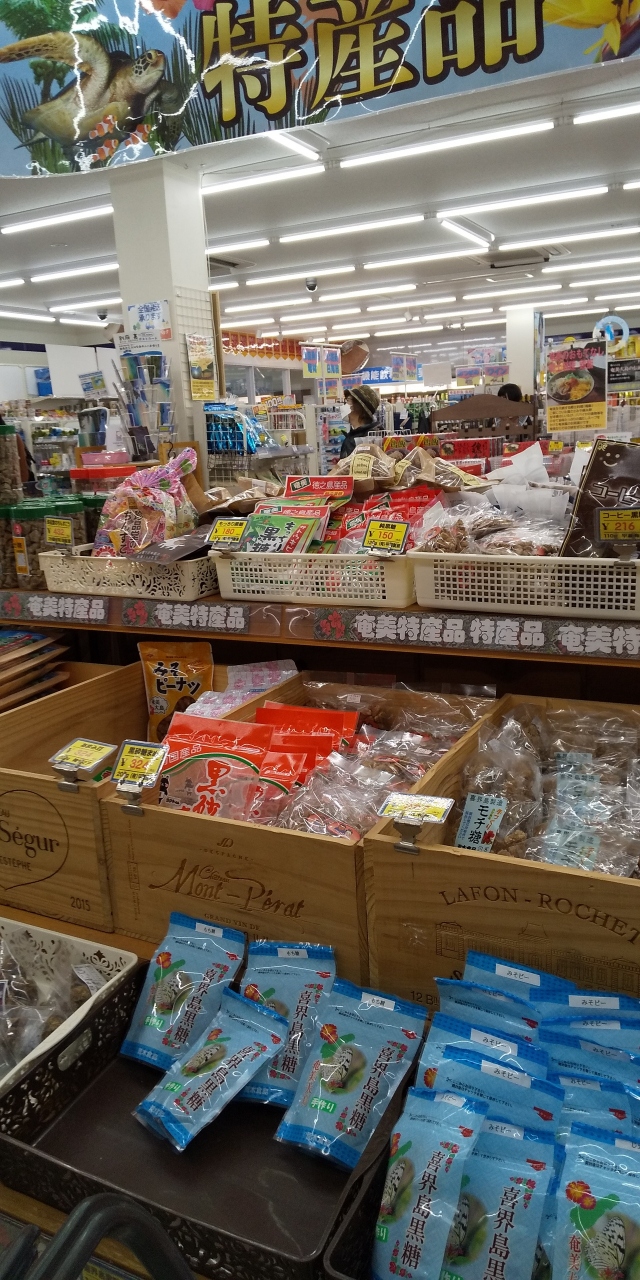 奄美大島の出発ロビーに並ぶお土産物を売るショップの一つです。奄美大島や近隣の奄美諸島の物産品を多数取り揃えていますが、こちらの冷蔵陳列物にはお弁当やおにぎりがあるので飛行機の中で食べたい場合はこちらが便利なお店。また本店と思われる店が空港近くにある