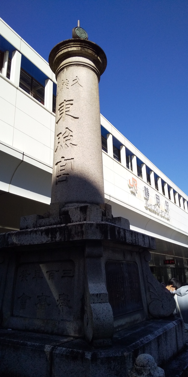 JR東海の静岡駅裏にある石でできたようなモニュメント的な石碑です。東海道新幹線の乗り場からすぐのロケーションです。周りにはスマートフォン片手に待ち人をまっているかのような人が数名。待ち合わせ場所としては分かりやすい石碑です。東照宮と言えば家康、静岡駅にあるのも頷けますが移設されて静岡駅にきたみたいです
