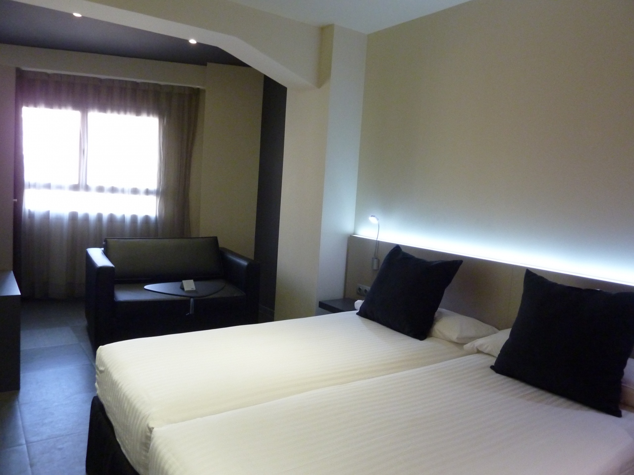 ツインルームに2泊しました。少々狭いですが、内装はきれいで、サグラダファミリアも徒歩圏内と便利。従業員の対応も親切だったので、ホテルそのものはいいホテルだと思います。ただ、ホテルの場所があまり治安のいい地区ではなさそうなので、その点は注意が必要です。