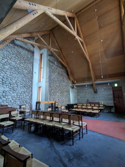 本館の長い廊下を歩き、何度か数段の階段も在り、本館の外れから一旦外に出て階段を下りたら、新館との連絡通路になります。
