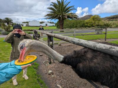 飼育されてるダチョウに餌をやる事が出来るとガイドさんに言われ、手のひらに餌を載せてダチョウのもとへ。と、いきないガバッと嘴で挟まれ、手の甲を擦り剥きました。歯は無いので噛みつかれた訳では有りませんが、吃驚しました。以降は餌を皿に載せて与えましたが、それでも迫って来る力は半端無く。良い経験になりました。