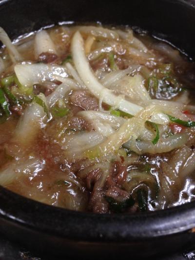 プルコギは甘い味付けをした豚肉の鍋みたいな感じで、キムチやチゲが辛いので交互に食べてちょうどよかった(笑)
