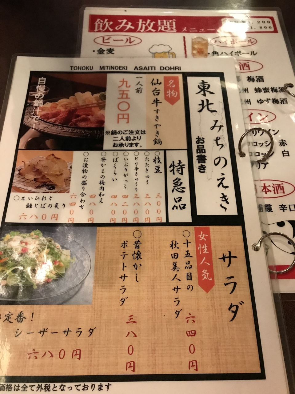 チラシには「牛タンサービス」または「プレモル580→390円(380円だったかも)。何杯飲んでも1杯あたり390円で提供」。飲むほうなのでビールのサービスを選択。アルコール飲まない人にはソフトドリンク無料です(何杯でも)。