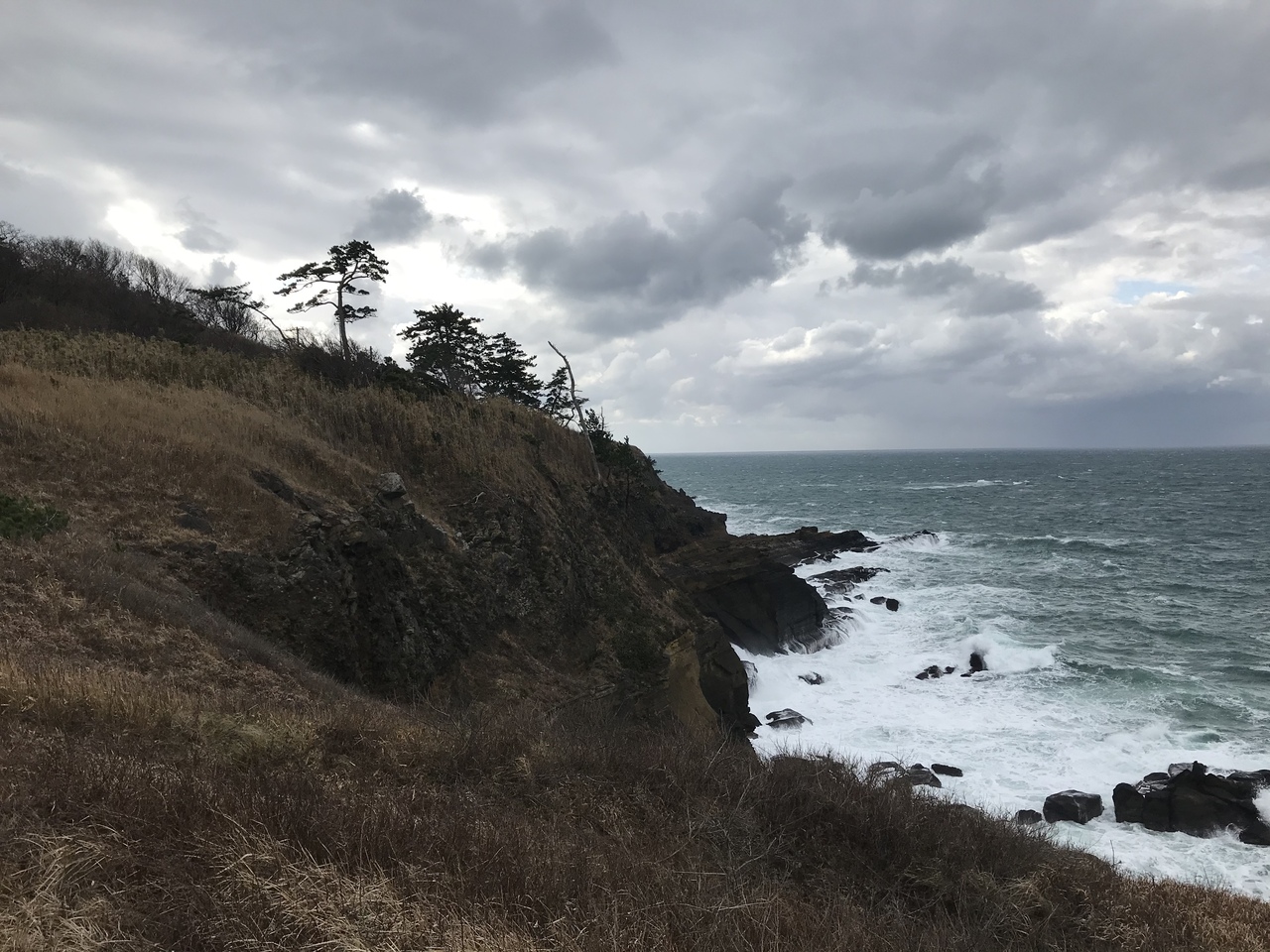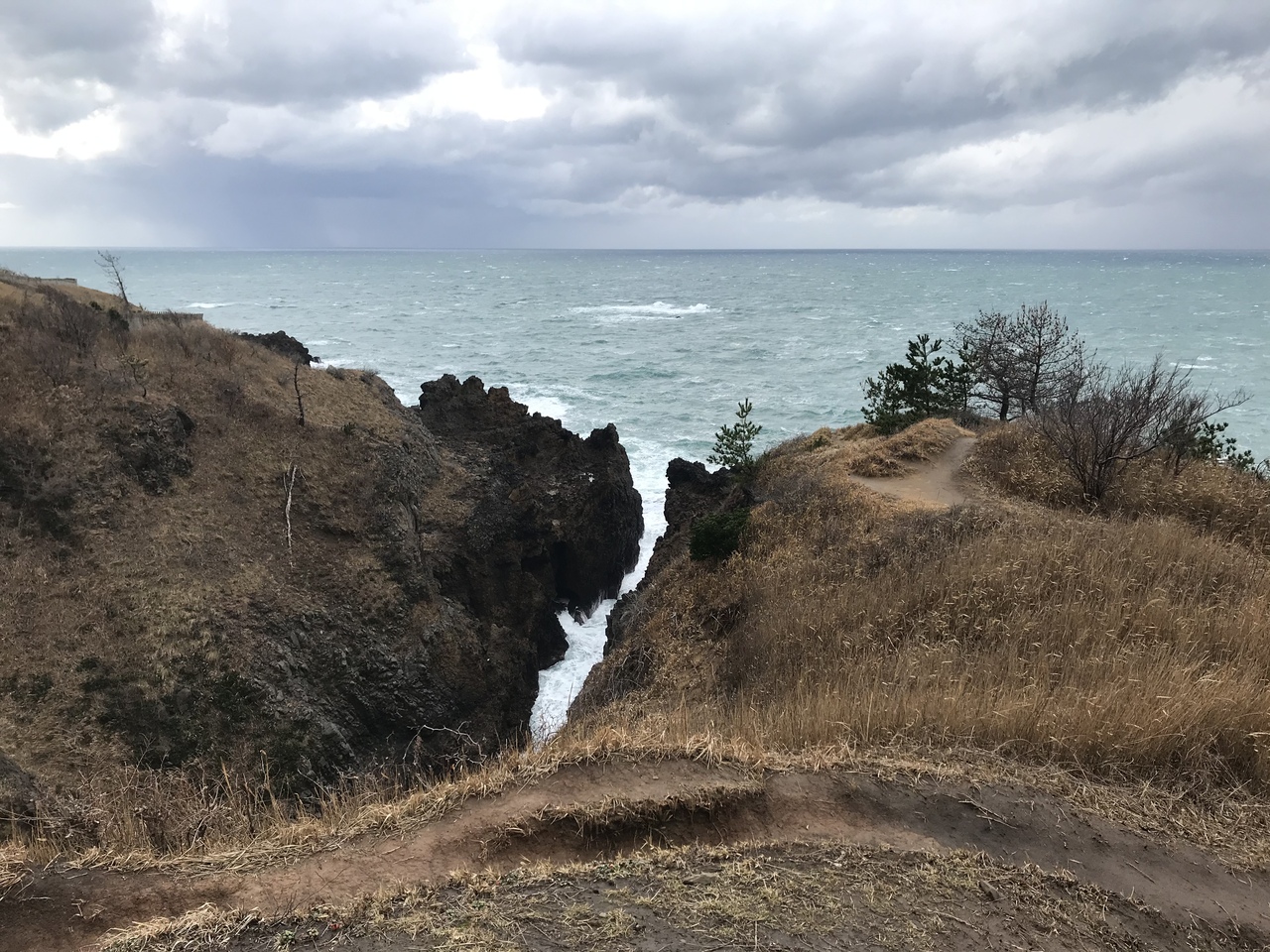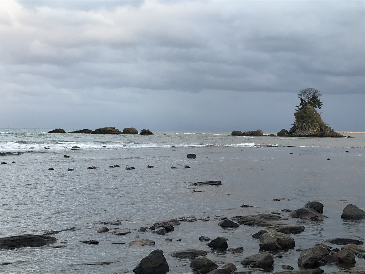 こちらの海岸の見どころは海岸入口の義経岩(源義経が雨が上がるのを待ったそうです)、会場の女岩。そして海の向こうに見える立山連峰。