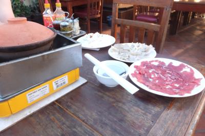 早めの夕食はスープドラゴンへ美味しい鍋だったけど、肉に卵つけて鍋に投入...