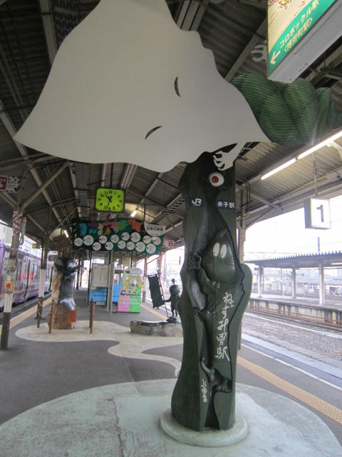 松江駅はねずみ男駅だそうで、境線の駅はそれぞれ駅にゲゲゲの鬼太郎のキャラクターがあてはめられています。松江駅はホームが可愛くて思わず写真を撮りたくなる場所です