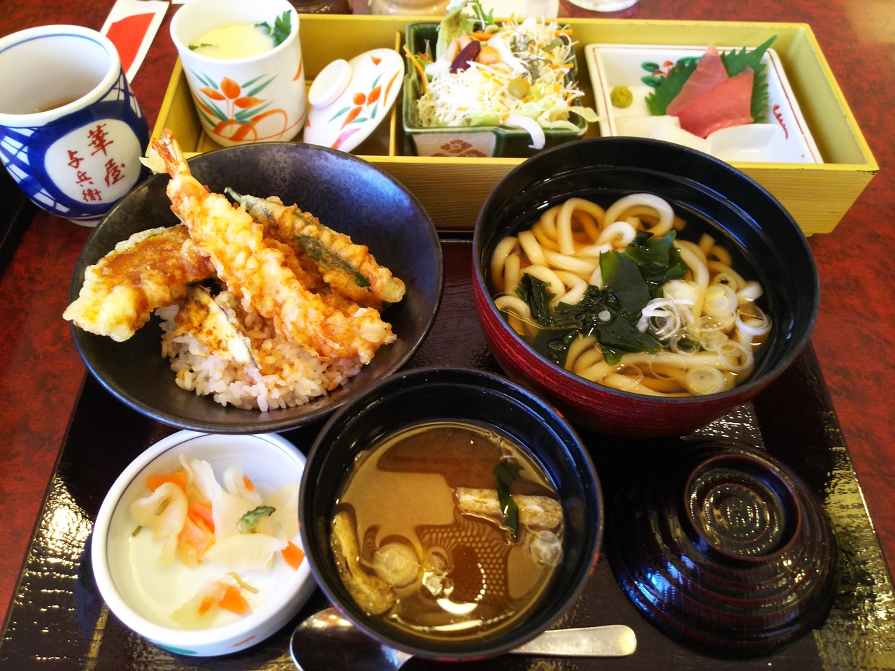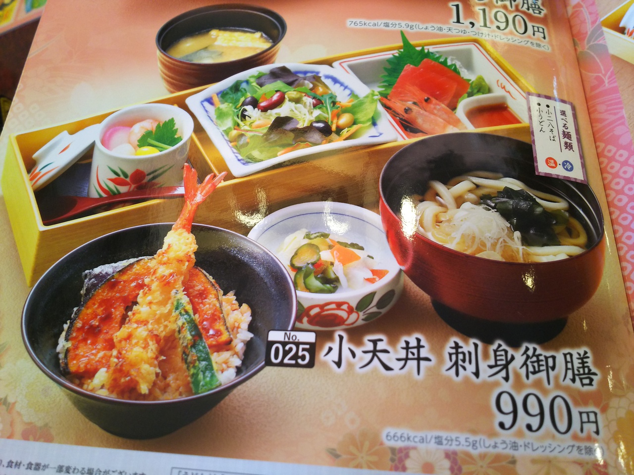 小天丼刺身御膳を注文しました。このラインナップで1000円切るなんて!!