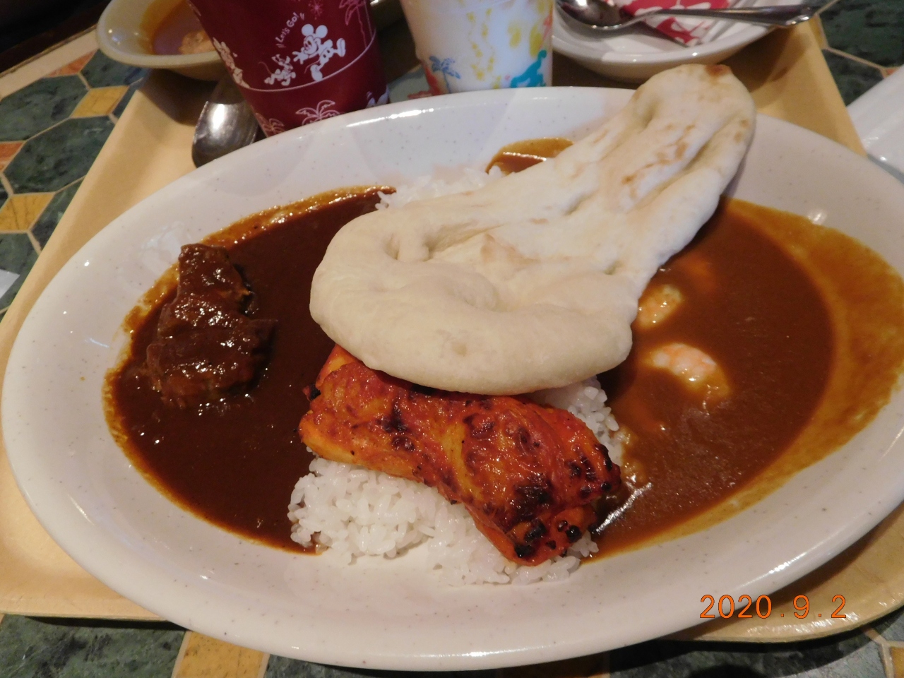 「コンビカリー、タンドーリチキン添え(中辛ビーフ&甘口シュリンプ)1300円」と「チキンカリー(甘口)900円」そして「ラッシー(オレンジゼリー&マンゴー)450円」を注文。お子様メニューがあれば、もっとベストでしたが・・・。