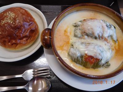 メイン料理はビーフシチューとロール白菜膳を旦那とシェア。