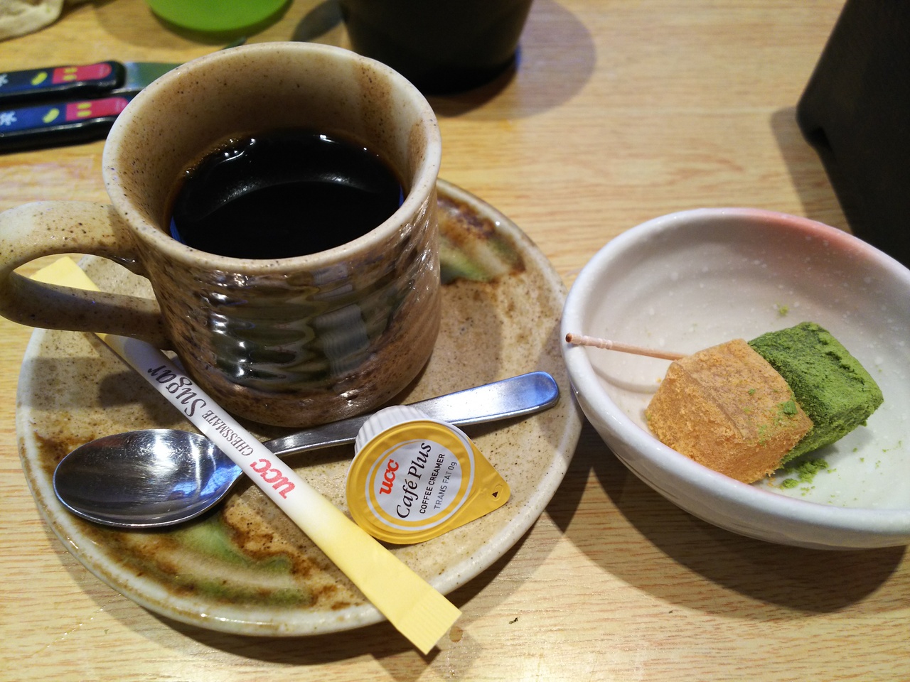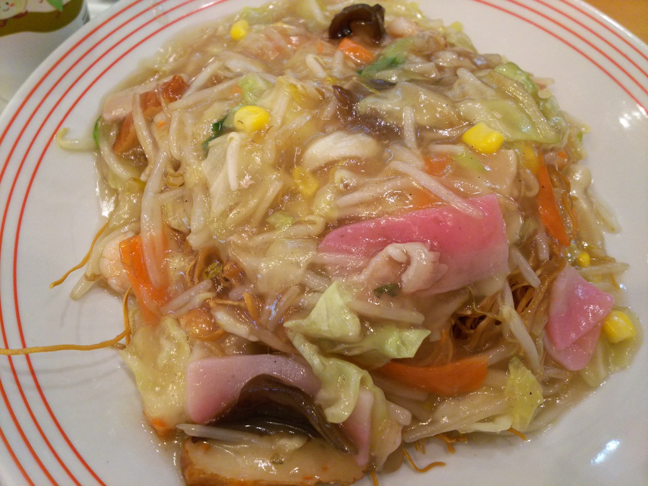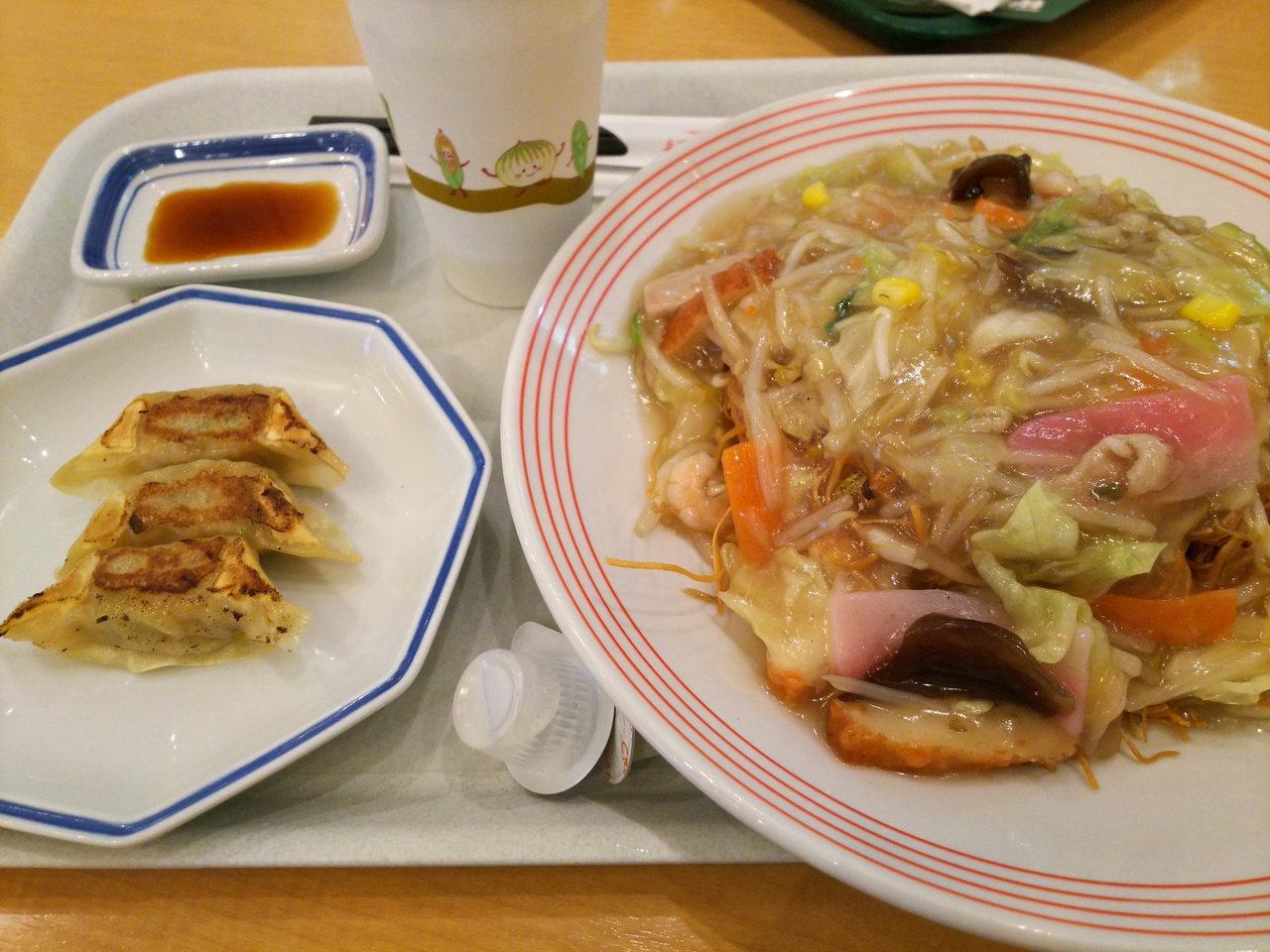 今日は皿うどんとセットで餃子とアイスコーヒーを注文しました。