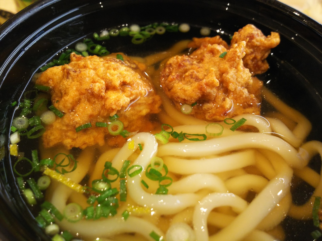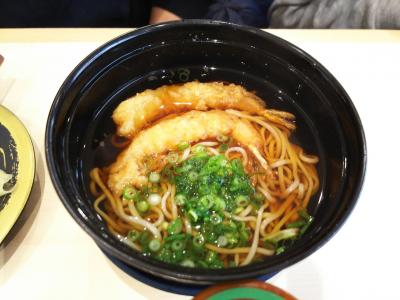 あたたかい汁物を一緒に食べたいので、海老天そばとまぐろ竜田うどんを注文したですが、1つ260円で、リーズナブル。