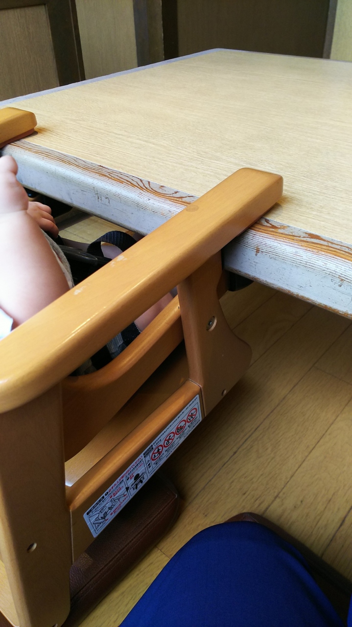 くら寿司のベビーチェアは、テーブルにしっかりつけるタイプ。すごく安定しているので落ちることもないですし、便利です。