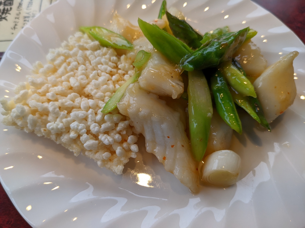 前菜から始まり、スープやおこげ、エビチリなどなど。締めは杏仁豆腐でした。