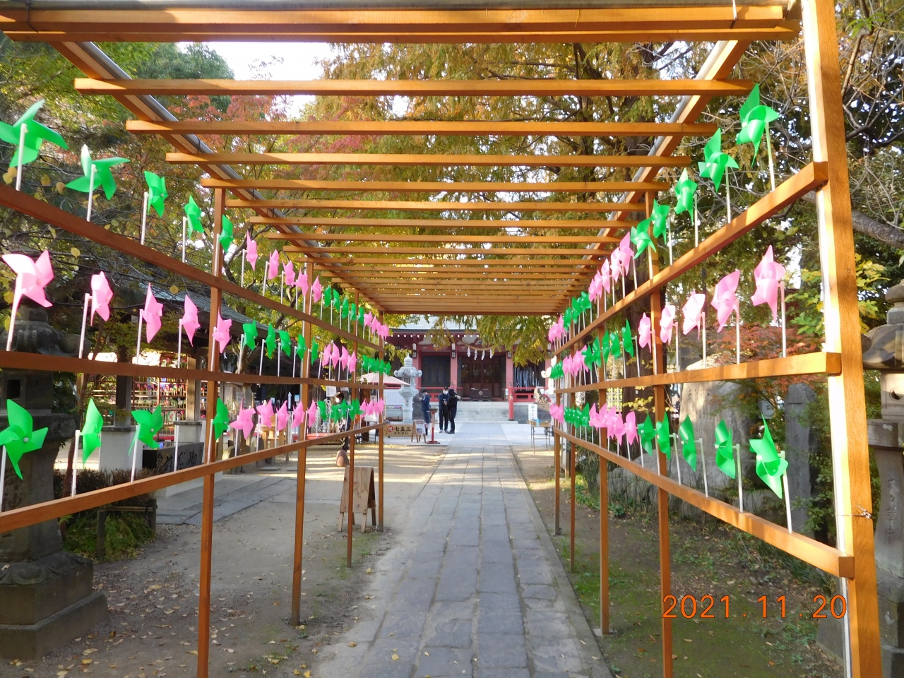 境内にはたくさんの風車や、写真撮影グッズ(和傘や刀剣)もありました。
