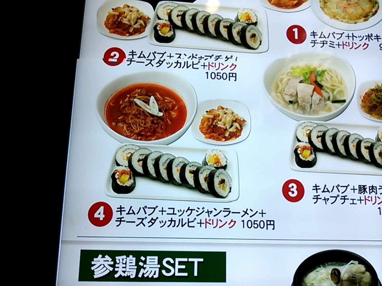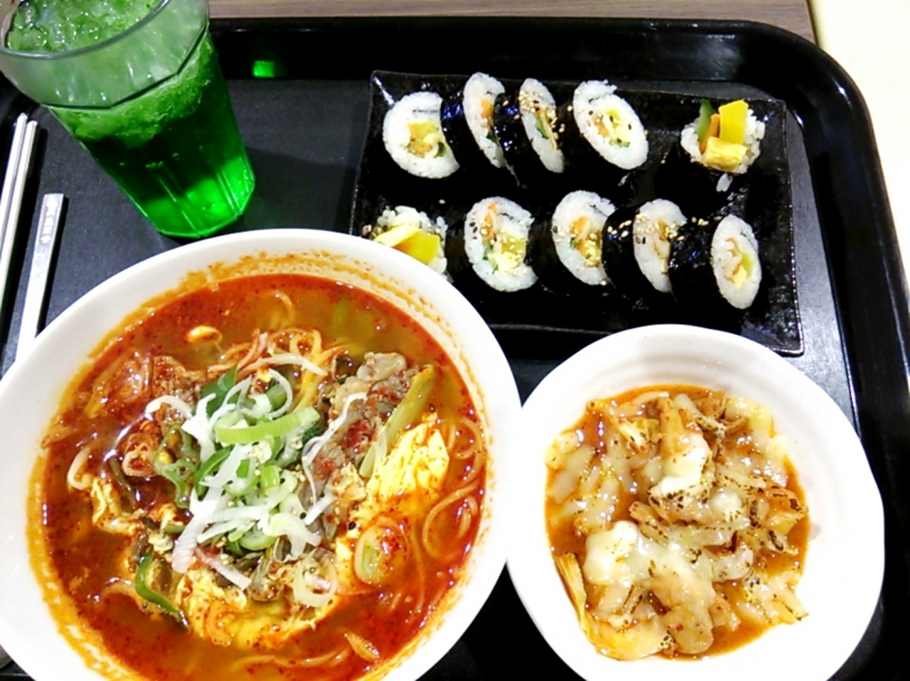キムパブ、ユッケジャンラーメン、チーズダッカルビ、ドリンクで1050円です。なんかお得感!!