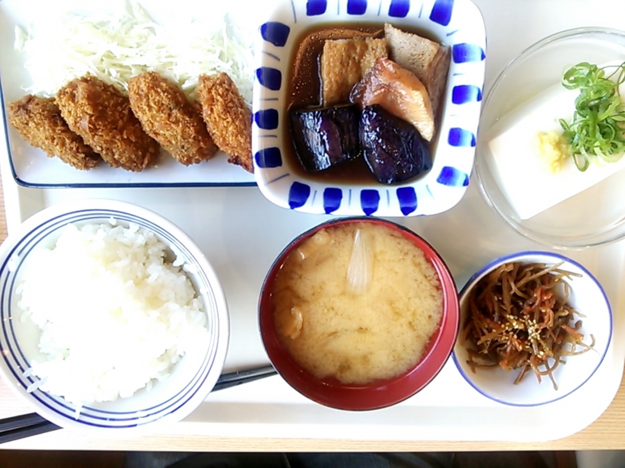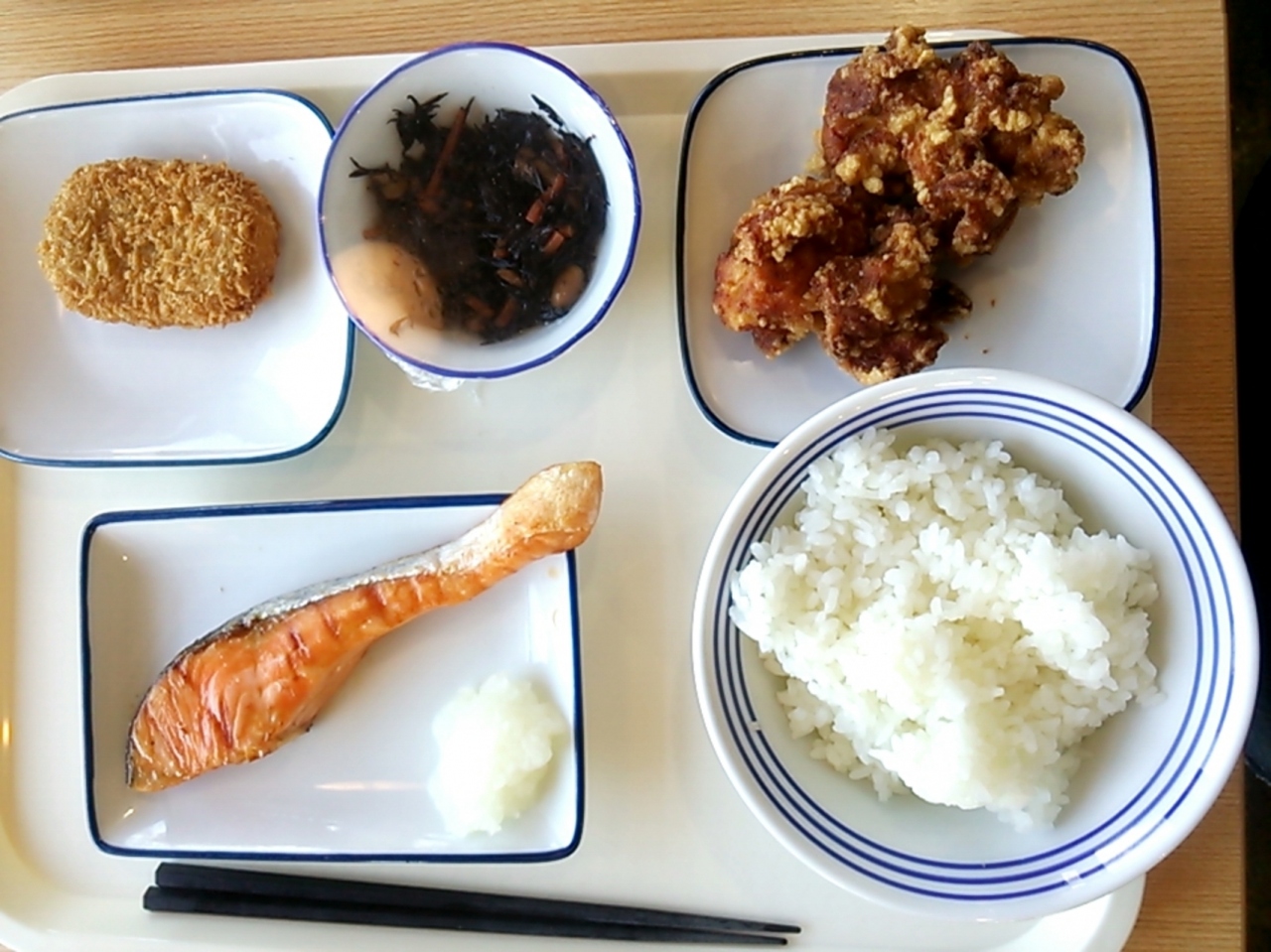 入るとたくさんのおかずが並んでいて、自分でお盆にのせて進むタイプ。