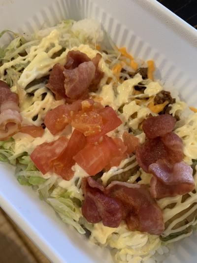 具材はアボカド、ベーコン、トマト、チーズ、レタス、タコミートでアボカドとベーコンが良いアクセントになっています。