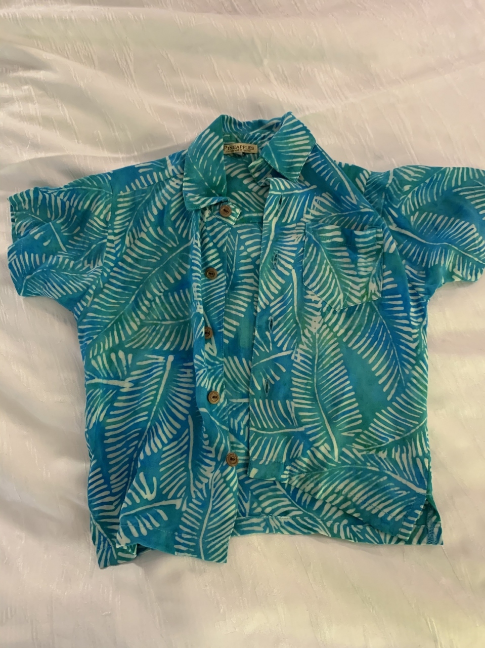 基本的には南国感溢れるデザインの服が多く、綺麗なブルーのものが多かったです。