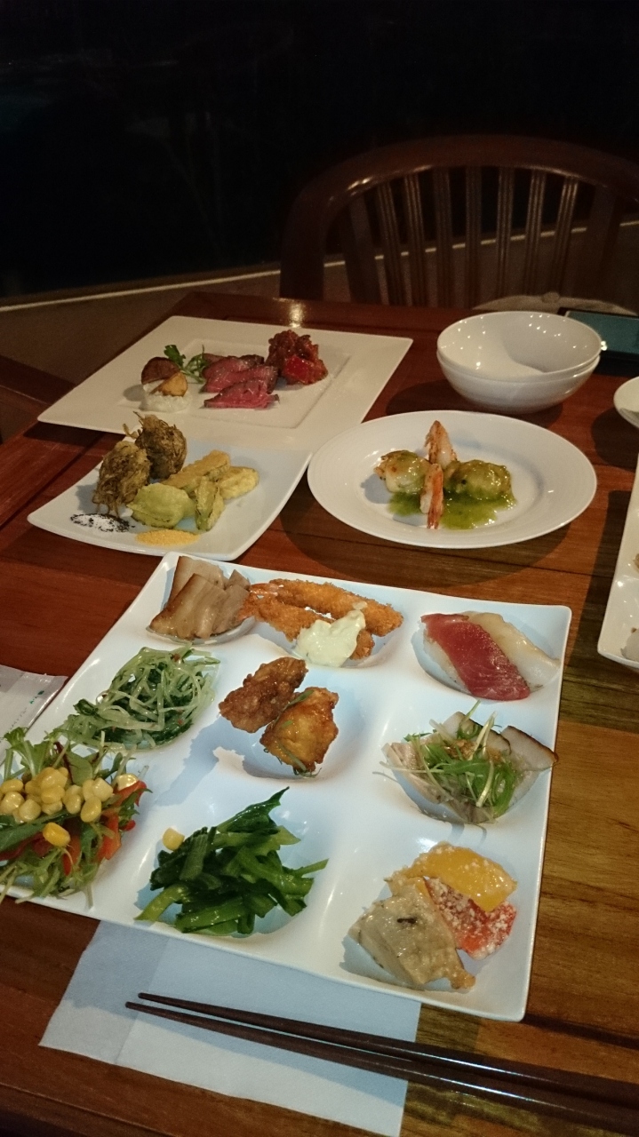 鉄板焼きや天ぷらのコーナーもあり、オーダーすると一皿に人数分を盛り付けてテーブルまで運んでくれます。