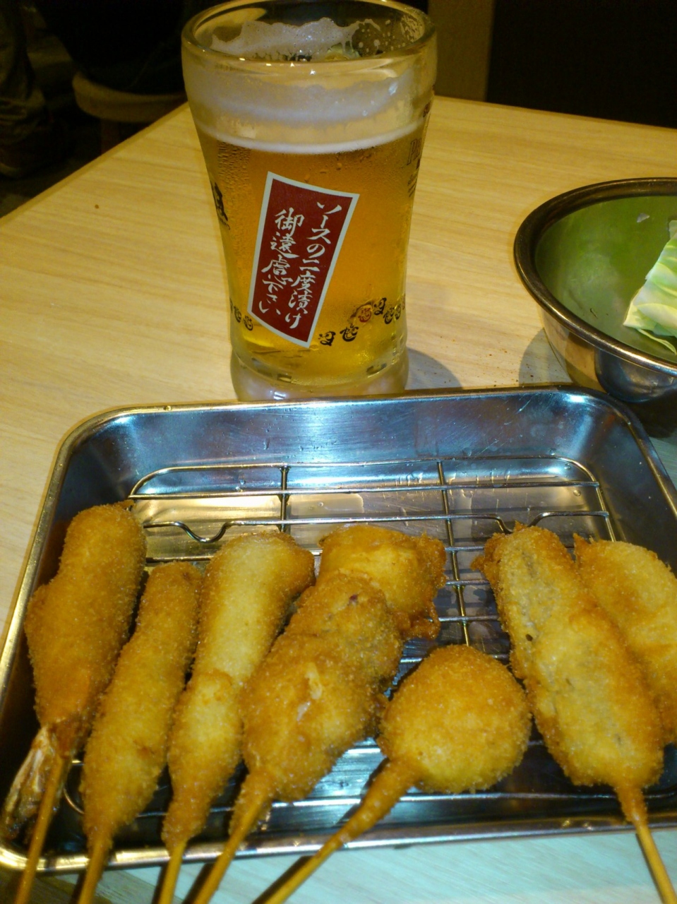 30分程並んだでしょうか、やっと店内に入り、どて焼きとビールに串カツを何本か頼みます。