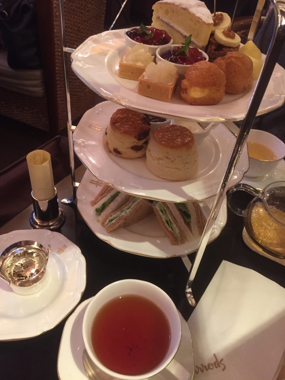 三段のアフタヌーンティーセットには、下段にサンドイッチ、中段にスコーン、上段にはケーキ類がのせられています。