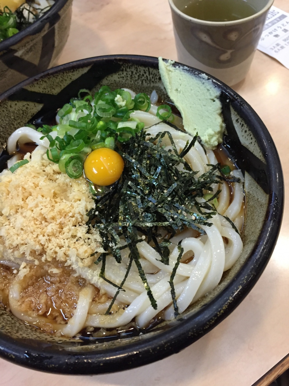 甘めのつゆに、天かすと海苔、ネギがしっかりとコシのあるうどんとマッチして美味しいです。また、山葵も良いアクセントになっています。- 旅行時期