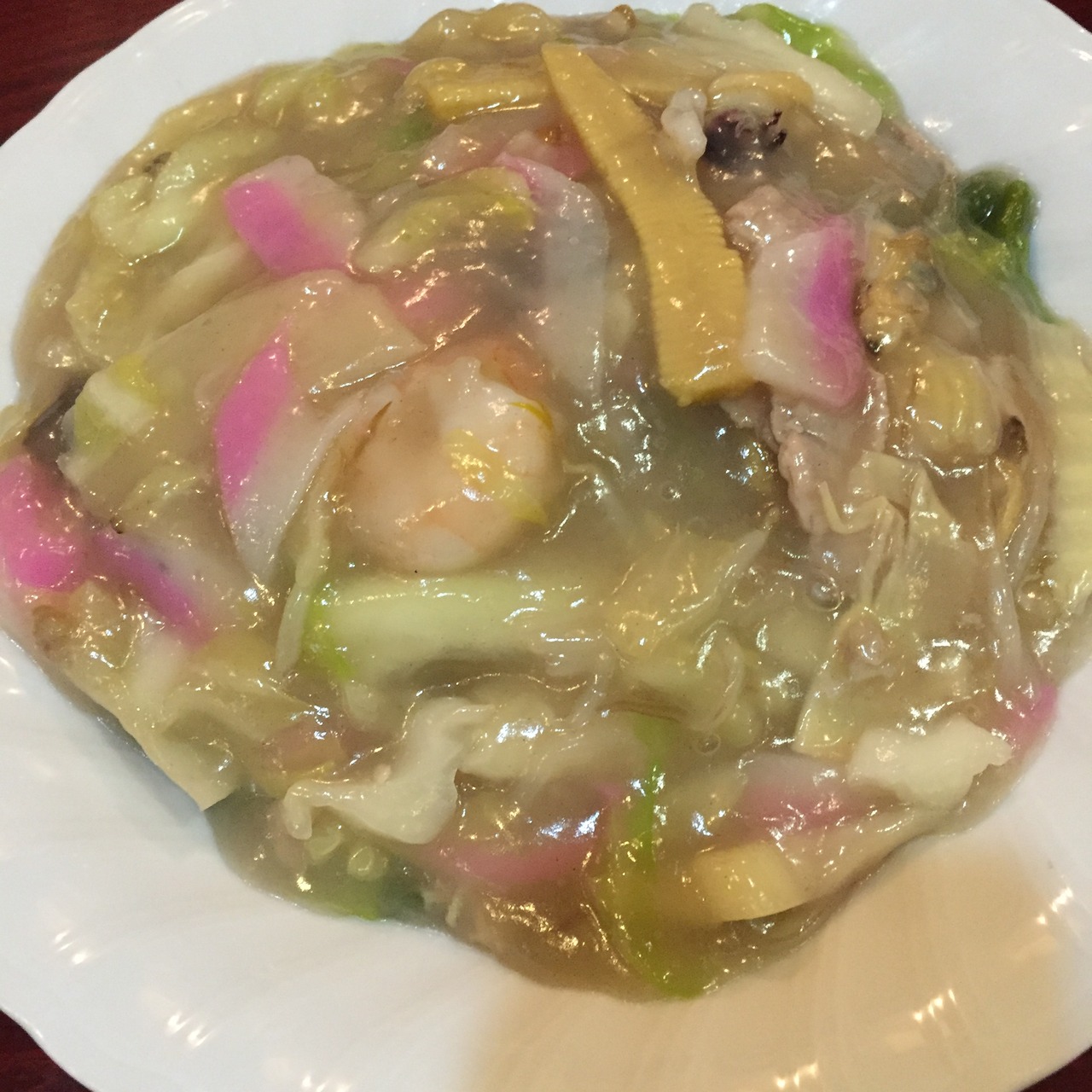 出てきた皿うどんは、ちゃんぽんの麺の上にあんかけが掛かったような感じで、見た目はあんかけ焼きそばといった感じです。