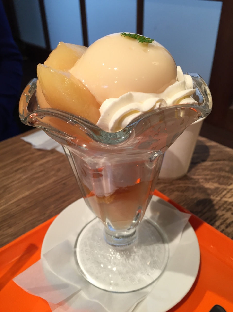 時期的に、岡山産の生フルーツはなく、他県産の果物か、岡山産の桃のコンポートを使用したパフェしかありませんでした。
