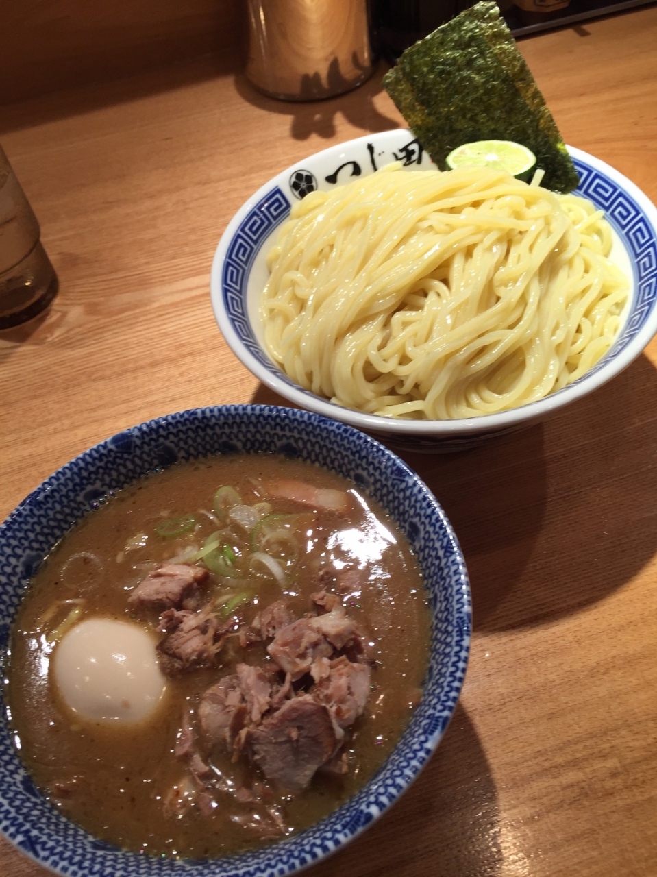 こちらの、つけ麺はトロみのある濃厚なつけ汁と、つるつるした麺のバランスが最高で、食べている途中にすだちを絞ると、味が締まり、また違った味になります。