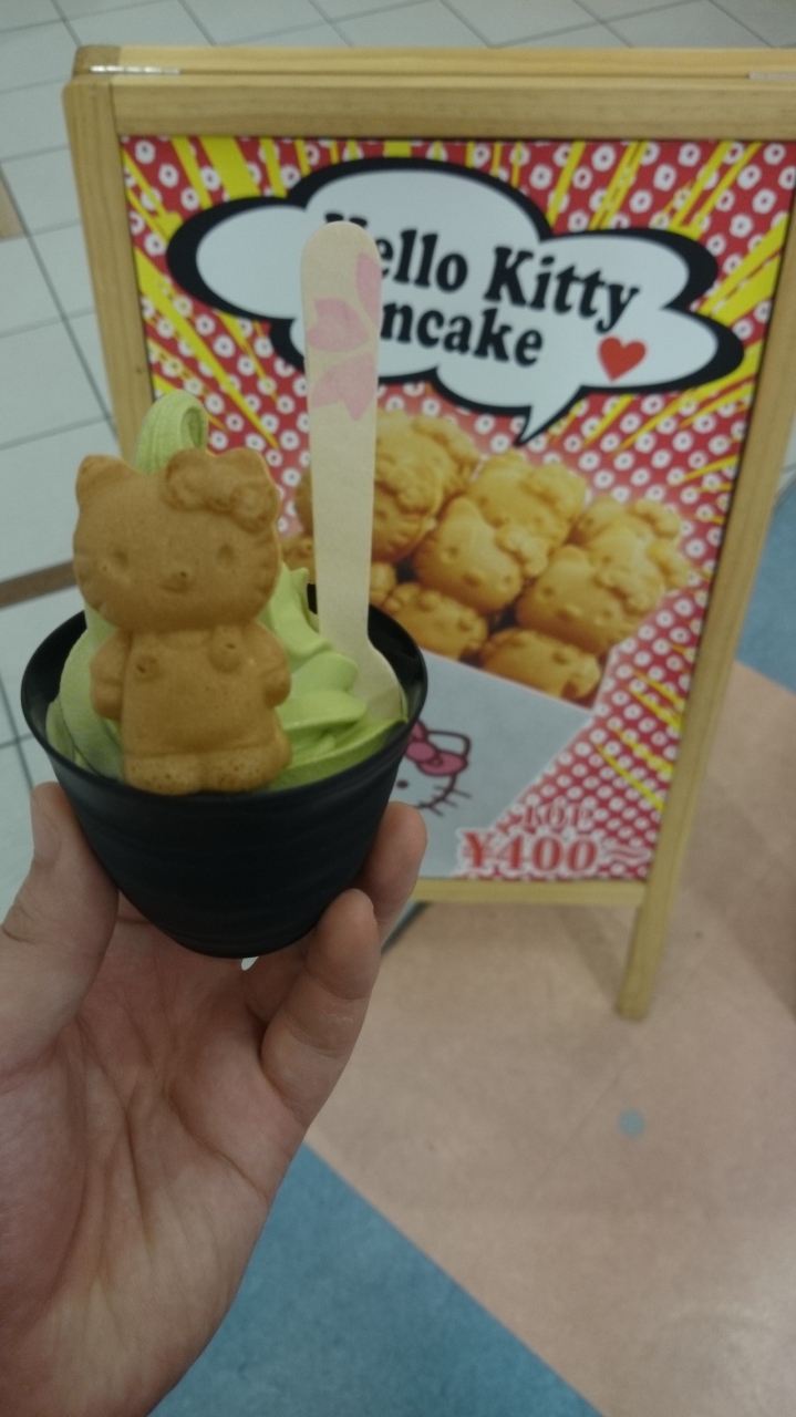 暑かったので、抹茶のアイスクリームを頼みましたが、アイスクリームにもキティちゃんの人形焼が1つ付いてきました。- 旅行時期
