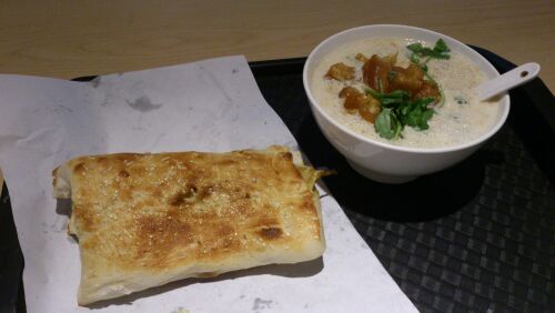 鹹豆漿と厚餅夾蛋を注文。鹹豆漿は少し塩味の固まりかけのお豆腐みたいな感じ。