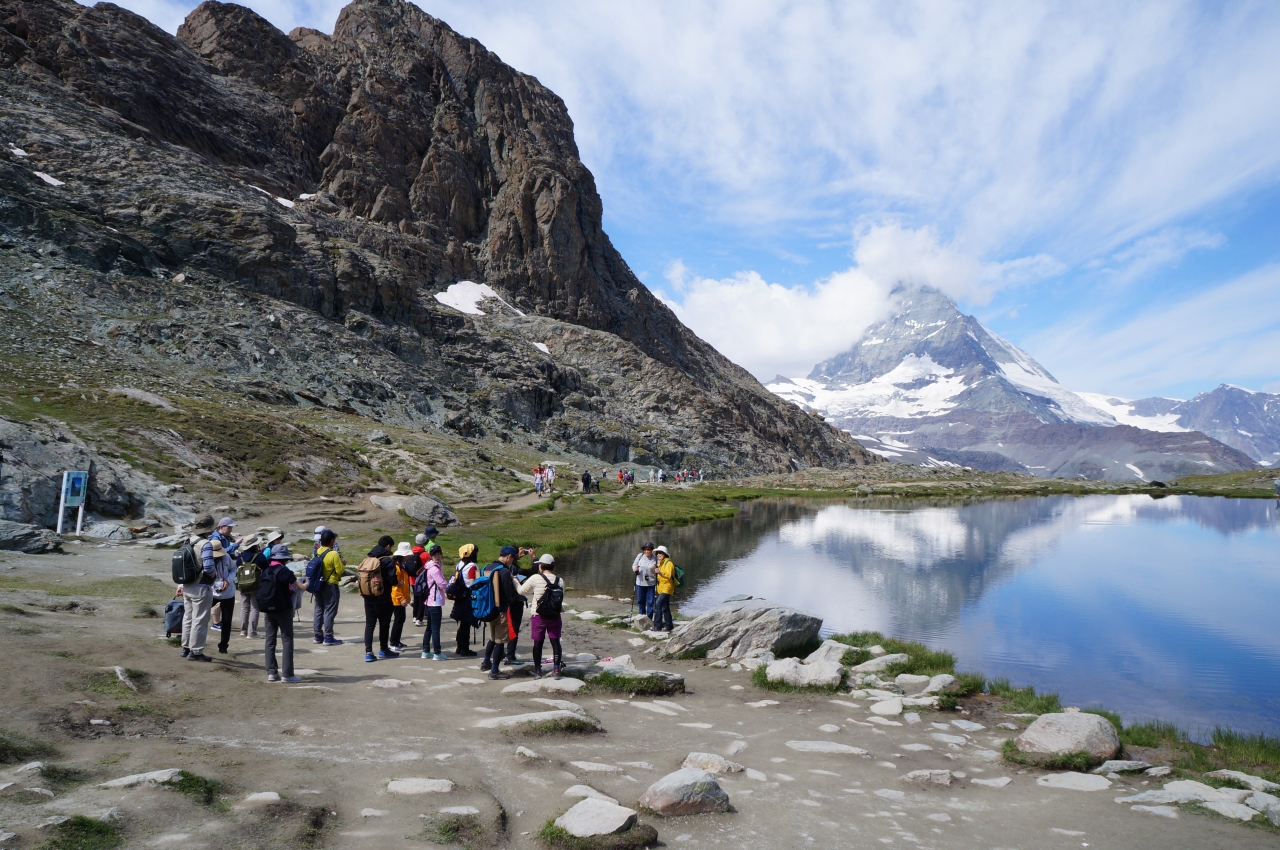 湖の畔の写真スポットでは、逆さマッターホルンと一緒に記念写真を撮りたい人で行列ができていたりもします。