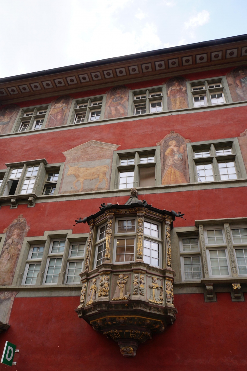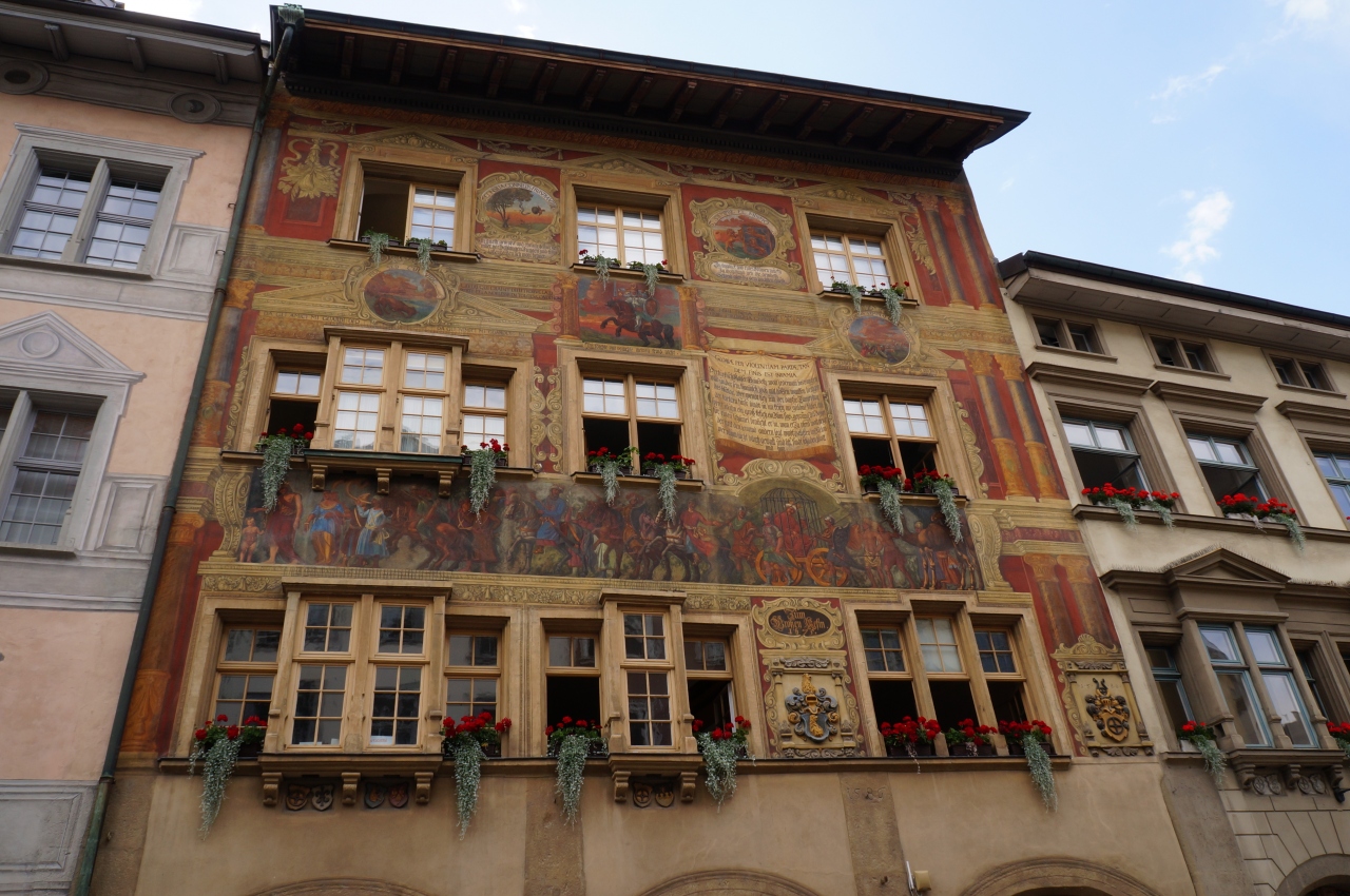 市庁舎広場からは数多くの装飾画がを見る事ができ、緻密で美しいフラスコ画は圧巻です。