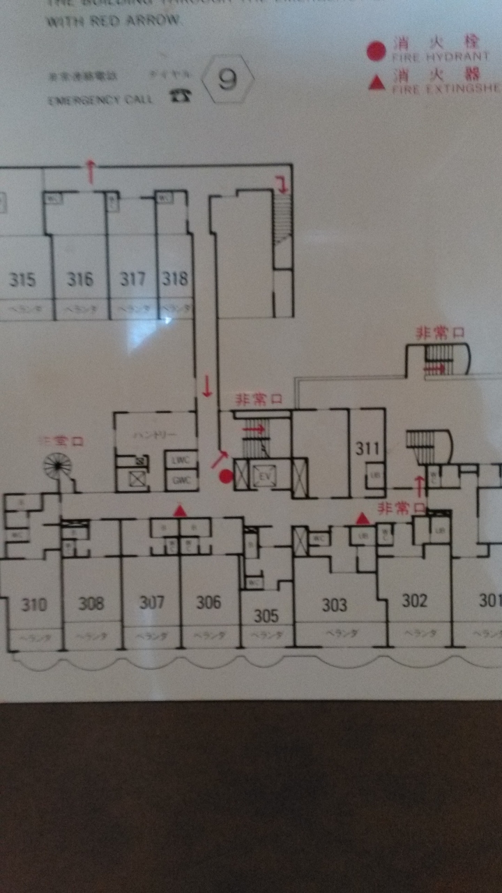 ホテルの玄関が狭く、フロアに非常階段があったかどうか忘れてしまいましたが、