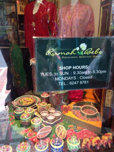 ショップハウスを利用した色鮮やかな外観で、ショーウィンドウに細やかなビーズを駆使したサンダルやプラナカンの民族衣装が飾られていて、見るだけでうっとりします。