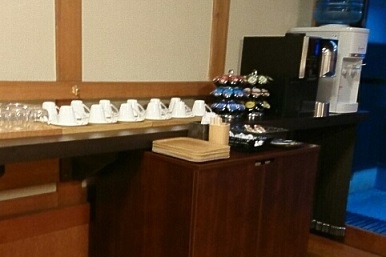 ロビー横の喫茶室は飲み物やおやつがフリー、図書室もありました。
