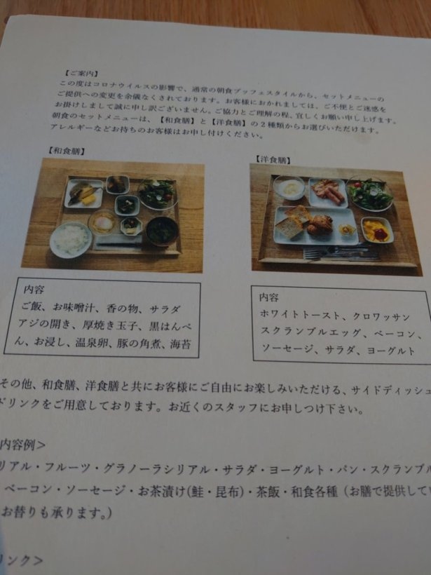 朝食はコロナの影響でビュッフェではなく、和食膳、洋食膳のどちらかを選びます。