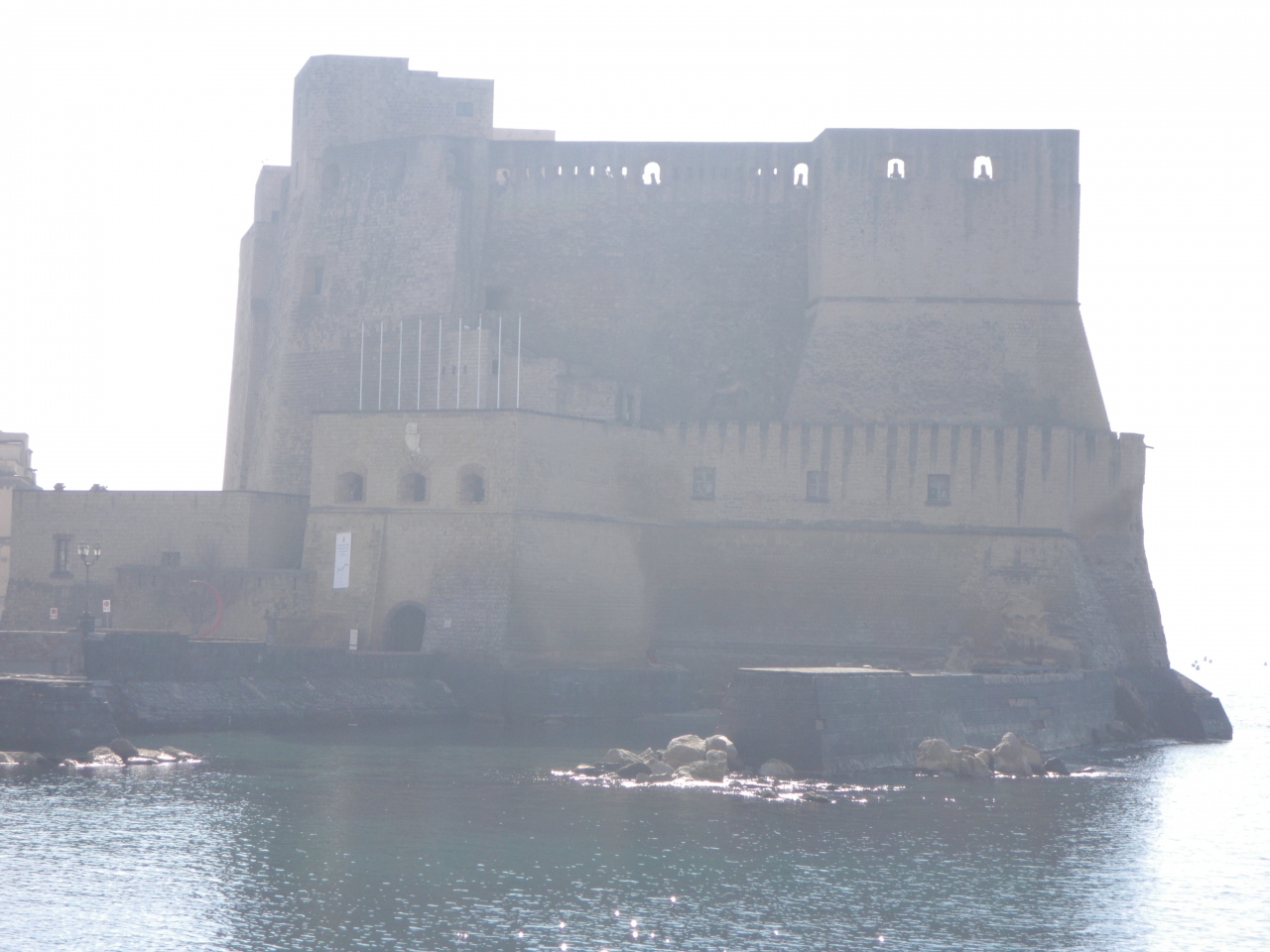 ツアーバスは、ナポリ市内はは危険との理由で車窓観光でした。ナポリに入り、やっとバスを降りた所は卵城前。ゴチャゴチャしたナポリ市内を抜けてドーンと広がるこの風景は本当に気持ちが良いです。遠くにベスビオ山、高級住宅地、色々見えます。南仏に似た雰囲気でしょうか。開放的で明るい雰囲気です。12世紀にノルマン朝により建造されたお城で、13世紀にはアンジュー家の王の住居にもなっていました。城の建造の際、基礎部分に卵を埋めて、この卵が割れる時、城もナポリも滅びるという呪文をかけられたそうですが、もうとっくに腐ってますよね(笑)